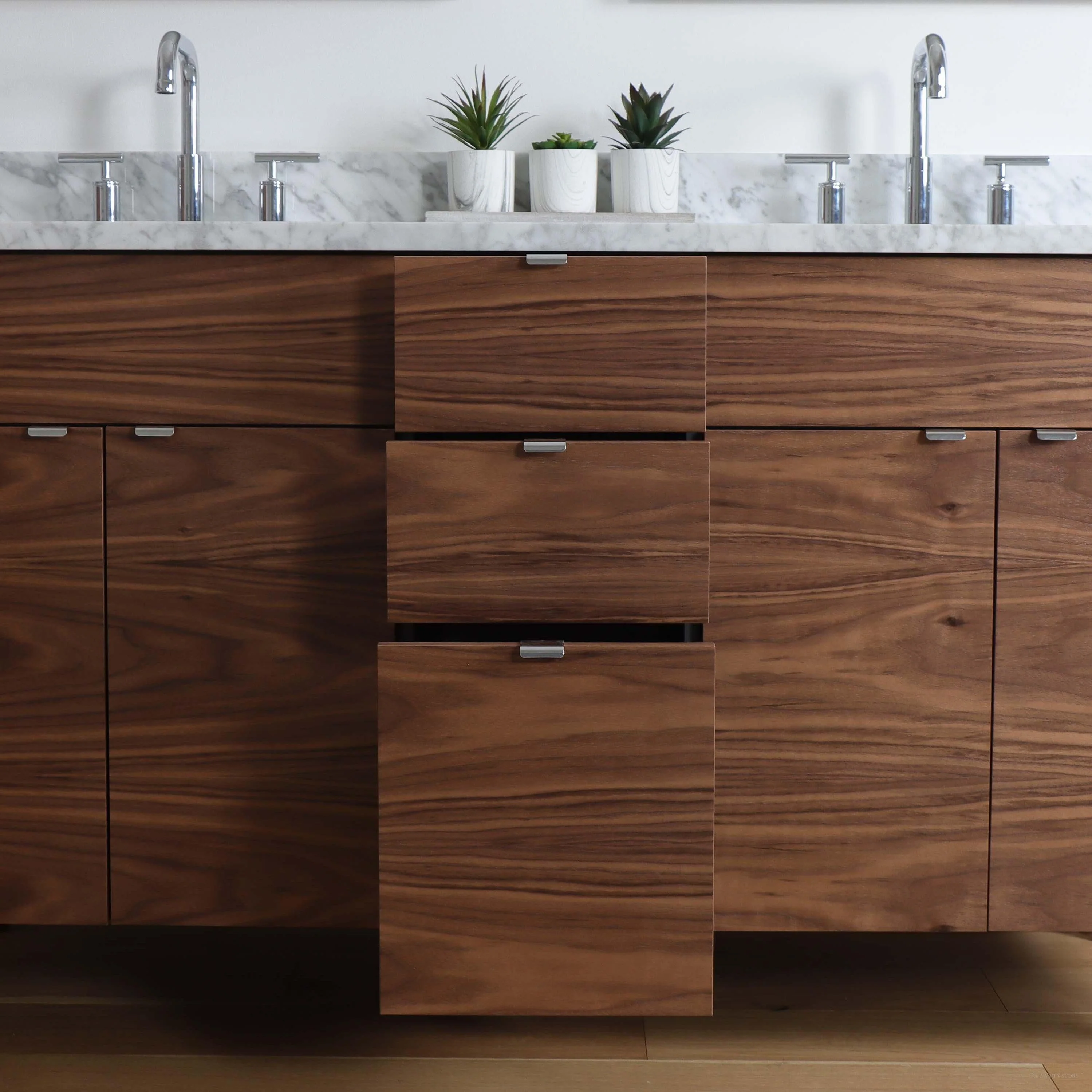 The door and drawer fronts are grain matched from one piece of walnut veneer, for a sleek modern look. The grain pattern will flow beautifully from one door to the next.
