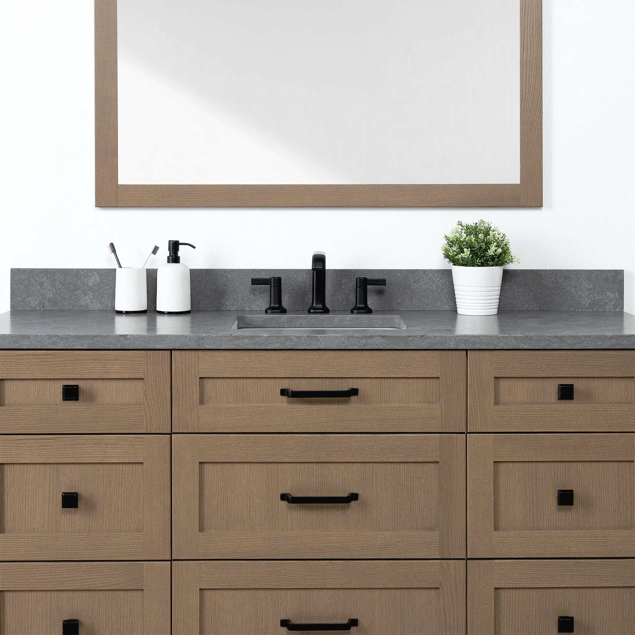 Bridgeport 60" Almond Coast Bathroom Vanity w/ Drawers from Canadian made Teodor® vanities. Transitional full oak shaker fronts and sides and tapered solid oak legs. These well made vanities feature solid wood and wood veneer over plywood construction. Top of the line hardware and soft closing, full extension drawer sliders. Intricate dovetail drawer box design, and a wide selection of beautiful finishes and stone tops.Â