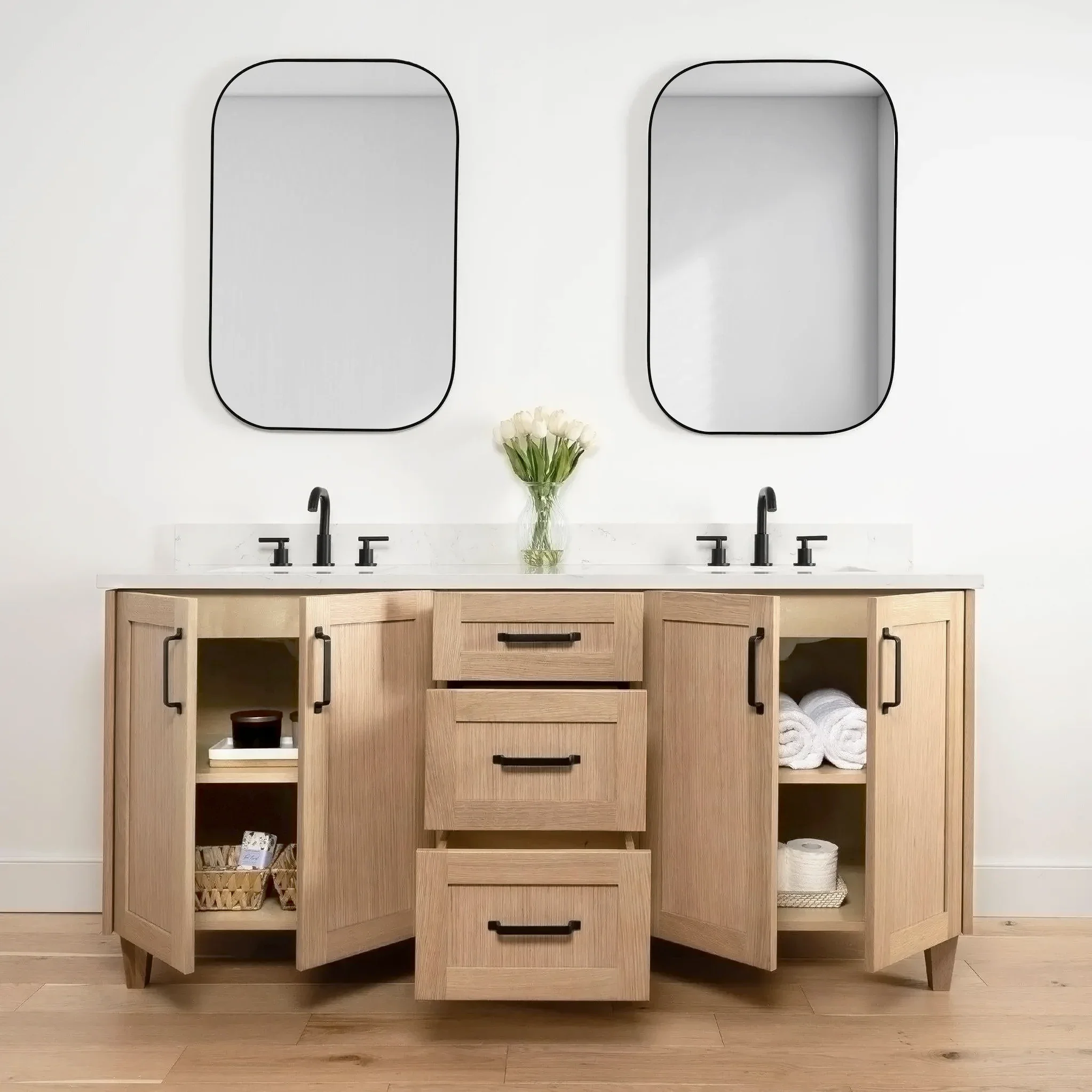 Bridgeport 72" White Oak Bathroom Vanity, Double Sink from Canadian made Teodor® vanities. Transitional full white oak shaker fronts and sides and tapered solid white oak legs. These well made vanities feature solid wood and wood veneer over plywood construction. Top of the line hardware and soft closing, full extension drawer sliders as well as BLUM® 110° full overlay hinges. Intricate dovetail drawer box design, and a wide selection of beautiful finishes and stone tops.